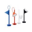 Rechargeable LED lamp consisting of three main elements connected by magnetic inserts. Aluminium base, steel stem with integrated rechargeable battery, polypropylene head, textile-covered head cable. Available in the colours black, white, red/ orange and blue.
