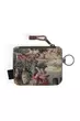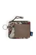 Zip pouch wallet with metal key ring, main zip compartment with rope loop zip pull, one exterior mesh pocket with fabric overlap.