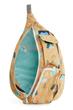 This cotton canvas sling features an adjustable rope shoulder strap with side release buckle, two vertical zip compartments, two key or cell phone pockets, and a padded back with KAVU embroidery.